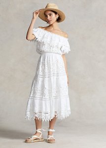 This romantic, bohemian-inspired off-the-shoulder linen dress combines eyelet embroidery with intricate Battenberg lace detailing.