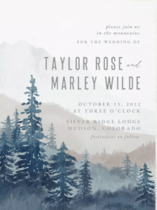 A romantic wedding invitation featuring an assortment of painted mountains and trees, paired with a rustic sans serif type. The back of this invitation features a gorgeous mountain backdrop paired with your wedding date’s details centered in the middle laid over a visually textured background.