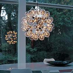 Taraxacum 88 is a suspension fixture providing direct and reflected lighting. The structure is formed by 20 pressed, polished aluminum triangles. 60 clear Globolux lamps housed around the structure. Steel ceiling fitting and canopy. Steel suspension cable. Ships with eight feet of cord.